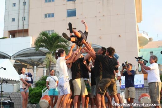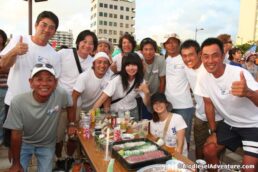 我が新丸は5時間26分でゴールして32位だった。途中からメンバー交代でウェイク(櫂:かい)を握らせてもらったわけだが、真上から太陽が照らす中、ひたすら海の上で漕ぎ続ける体験は、強烈なものだった。かけ声に合わせて声を張り上げウェイクを漕ぐという体験はアドレナリンが出まくりだったのか、途中から至福感に満ちあふれ、もっと漕ぎ続けたいという気持ちが沸いた。心よくメンバーに入れてくれた新丸のクルー達は渡嘉敷島に住んでいるものの海人はその中の1人ぐらいで、その他のクルーは役場の職員だったり、ホテルの経営者だったりと、海の専門家ではなかった。また、仕事も忙しくメンバーが揃って練習したのも数回だという。経験のない僕をよくクルーにいれてくれたものだ。新丸の皆さん大変お世話になりました。
