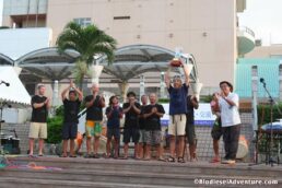 表彰式は午後6時から「とまりん前広場」で行なわれた。昼過ぎにゴールしてホテルもとっていなかったので、この広場で昼寝をして時間をつぶす。みんな着替えてすっきりとした姿で広場に集まって来た。