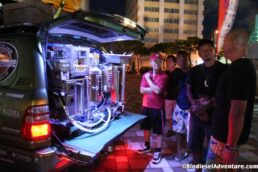 主催者の粋な計らいで表彰式会場にバスコファイブを置かせていただいた。食事がある程度終わったら興味のある者達がバスコファイブに集まって来た。さっそく、仕組みを説明したり、天ぷら油でどうやって走るのか、等々話に花が咲いた。