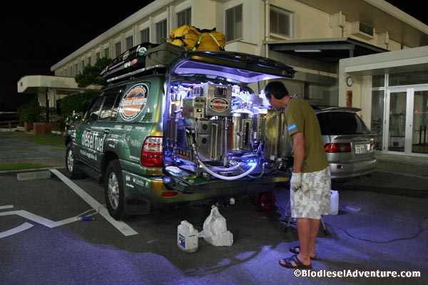 宿泊所に帰ってからバイオディーゼル燃料の精製にとりかかった。沖縄はけっこう広い! 思ったよりも早く燃料がなくなってきたので、燃料を作れる所でどんどん作って行かないと立ち往生してしまうのだ。今晩も燃料を作りながら夜が更けてゆくのであった。