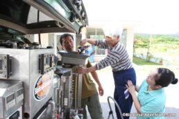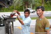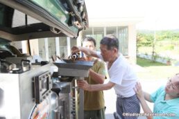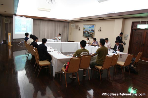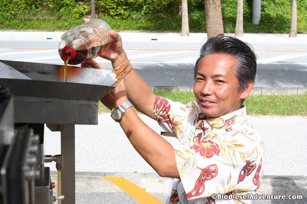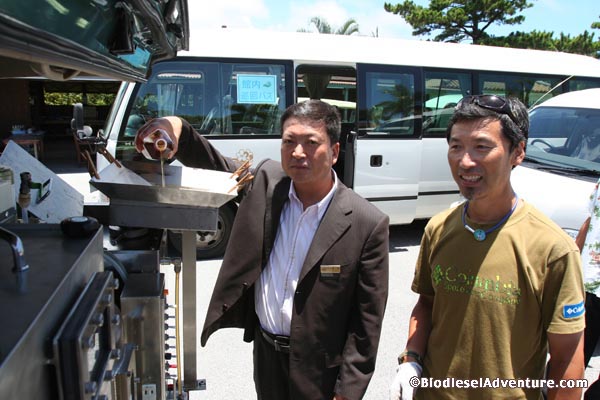 次に向かったのは「カヌチャベイホテル&ヴィラズ」。やんばる・東海岸の約80万坪という広大な敷地に施設&ゴルフコースをもつ高級リゾートだ。ここではバイオディーゼル燃料に興味があり、その様々をぜひとも知りたいとのこと。とてもうれしく光栄だ。贅沢にも広い一室をご用意頂き、バイオディーゼル燃料のこと、精製や機械の詳細を中心にトーク。実際にバスコファイブに油も入れて頂いた。最後はリゾート内のレストランで美味しいお食事までご馳走していだきました!