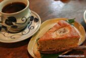 東村の旅路の途中、どうしても寄りたいカフェがあり、中村さんになんとか時間を調整してもらい「カフェ山甌(やまがめ)」へ。ここは山の谷間、やんばるの森の中にあるオーナー手作りの木製カフェ。じつは3年前に参加した「アースラン」で立ち寄ったことのあるお気に入りのお店なのだ。木々や葉の香りと川のせせらぎ。テラス席に座り、ケーキセットとコーヒーでちょっと休憩。うーん、気持ちがいい。メニューは添加物を一切使用しない自然食メニュー。お店の一角には地元アーティストたちのさまざまな作品や小物が並ぶ。自然と人の調和が感じられるお茶屋さん、癒されるなぁ。