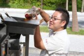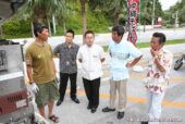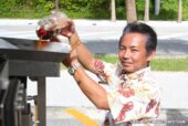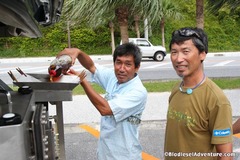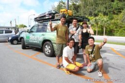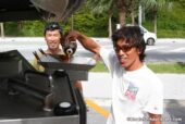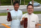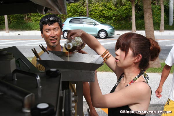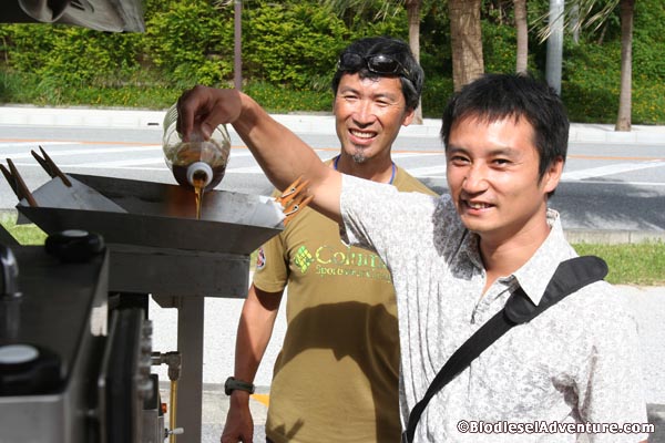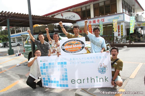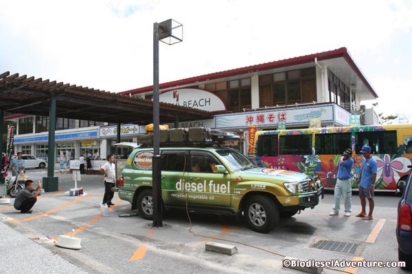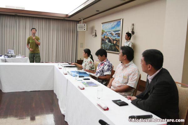そして最後は、西海岸の「かりゆしビーチリゾート・オーシャンスパ」へ。ここは平成16年に県内で始めて「エコアクション21」の認証を取得した、エコホテルを目指したビーチリゾート。皆さん僕らの到着を待っていてくださって、到着するとすぐにバスコファイブの説明に耳を傾け、さらに油も注いで頂いた。