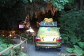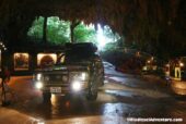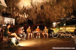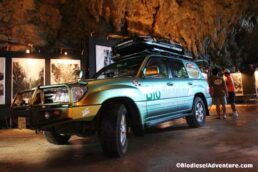 いよいよ洞窟へ。芝生を抜け、樹木たちの間の坂道をバスコファイブで下りると、穴がぽっかりと口を開けている。一旦車をとめ深呼吸をし、慎重に奥へ入ると、広い洞内に辿り着いた。世界一周をしたけれど、こんな空間にバスコファイブを入れたことはなかったな。シャッターをきり、少しの間静かに場所を感じてみる。岩と岩の間から夕暮れの光をうけ岩肌が黄金色に輝いている。どこかひんやりとした空気には樹木や岩々の呼気が宿り、呼吸をすると身体の内側から浄められるようだ。きっと相棒バスコファイブも同じことを感じているに違いない。