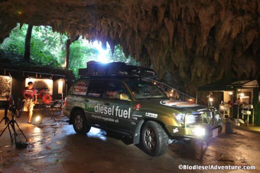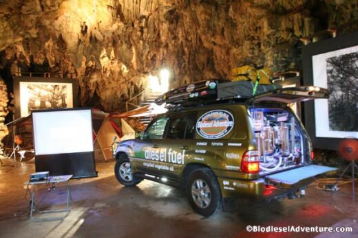 この日もたくさんの方に廃食油を頂いた。普段は昼間の講演であまり披露できないが、LEDライトが光るバスコファイブの夜の姿もゆっくり見て頂くことができた。この日、ケイブカフェに飾られていたガジュマルの写真を撮影した小町さんにもご来場頂き、油を注いで頂いた。
