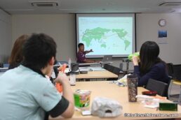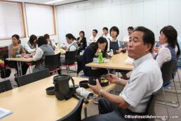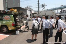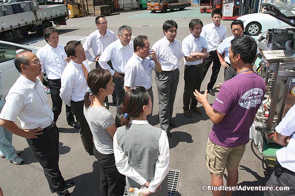 この日は、お昼休みのお食事タイムに、社員の皆さんへ向けてスライドトークショー。忙しい勤務時間の合間にも関わらず、皆さんとても熱心に見て頂きました。その後に実際に油を入れて頂いて、記念撮影を皆さんとパシャリ。うーん感慨深い!