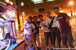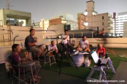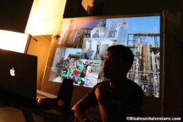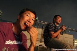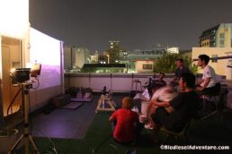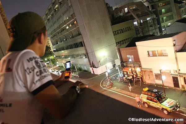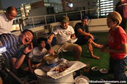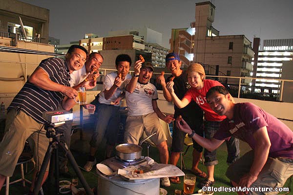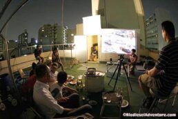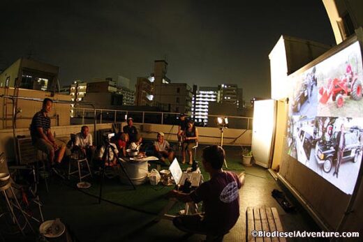 というわけで皆でお向かいさんの屋上におじゃましま〜すと荷物をもってぞろぞろ移動。プロジェクターは、レスキュー隊の木元さんが用意してくれた。彼はいつも困ったとき助けてくれる。バイオディーゼルアドベンチャーの救助隊でもあるのだ。さらにありがたいことにライトのセッティングも完璧にしてくれた。