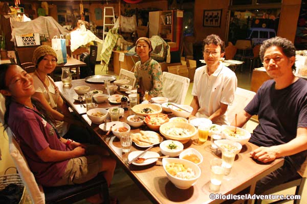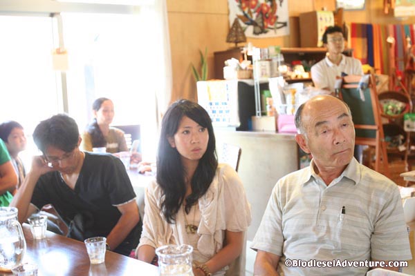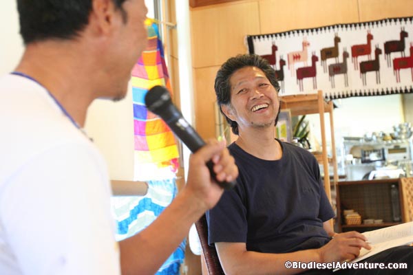 後半はオーナー中村隆市さんとの対談。中村さんはフェアトレードのパイオニアで、僕は以前六ヶ所村の2007アースデイで初めてお会いした。そのときにアースデイに関わる色々な方を紹介してくれたり、ナマケモノ倶楽部のことやカフェスローなどについていろいろ教えていただいたのを覚えている。このプロジェクトがスタートしたとき、中村さんはどこかでバスコファイブに相乗りしたいと言ってくれたのだが、スケジュールが合わず、会えないでいたのだが、やっとここで再会することができた。