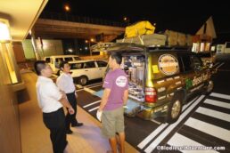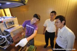 北九州市はバイオマスタウン構想のエコモデル都市でもある。そのそばにガソリンスタンドを構える松田さん、緒方さんのお二方と高松さんのお知り合いの華山さんの3人とお会いした。バイオディーゼル燃料に以前から関心があり、ゆくゆくはガソリンスタンドでバイオディーゼル燃料を売ることを考えておられるとのこと、また、そのガソリンスタンドの2階でハンバーガーショップも併設して営業しているという。新しい形態のガソリンスタンドを経営することを夢見て、将来のことを熱く語っていただいた。
