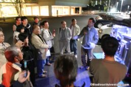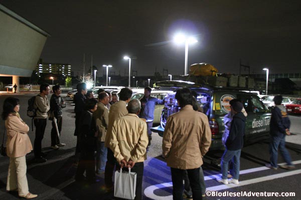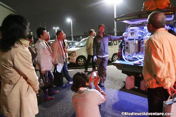 室内での講演の後、8時20分ころから外の駐車場に出てもらい、実際の車両をみてもらいながらバイオディーゼルカーの紹介をさせていただく。