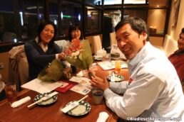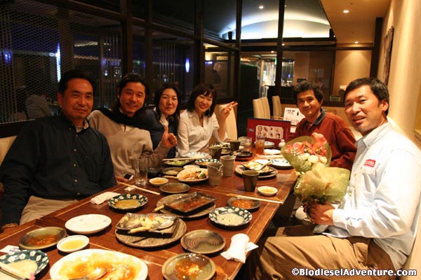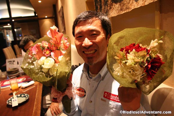 打ち上げ夕食会も楽しい会話が飛び交い、ほんとうに話がつきない充実した時間でした。最後に花束をいただき、また会で集めたバイオディーゼルアドベンチャーへのプロジェクトへの協賛金をいただき、本当にありがとうございました。
