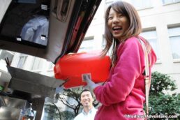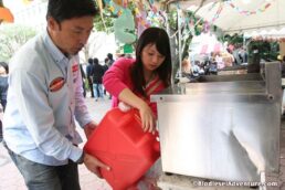 この日、青山祭は16時に終了し、学生さんたちが出店で使った油をフライヤーからポリタンクに移す作業を手伝う。全部で約35リッターほどの油が集まった。それをバスコファイブに注ぎ、17時半に終了。