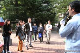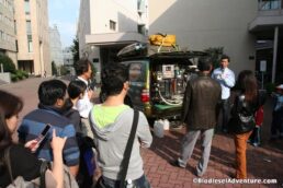 大学の敷地内にバスコファイブを置かせて頂く。すると不思議そうな目をして立ち止まり、「これは何ですか〜?」と聞いてくる人が後を絶たず。僕はマイクを使って、なるたけたくさんの方に聞いてもらえるよう質問に答えた。