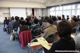 この日講演させていただいたテーマは「バイオディーゼルカーで視た世界の環境とエネルギー」。雨天にも関わらず、菜の花プロジェクト関係者や一般市民など、なんと150人もの方々にお集まりいただいた。