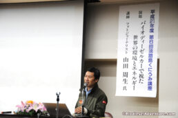 講演後は、地元在住・岡田さんの「”あわじ葉の花エコプロジェクト”廃食油回収セミナー」。岡田さんは元理科の先生で、現在はNPO菜の花プロジェクトネットワーク理事・環境カウンセラーとして活動されている。淡路島の魅力はもちろん資源循環型社会について国内外問わず発信と勉強をされているとてもパワフルな方だ。