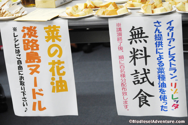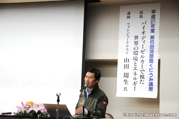 この日講演させていただいたテーマは「バイオディーゼルカーで視た世界の環境とエネルギー」。雨天にも関わらず、菜の花プロジェクト関係者や一般市民など、なんと150人もの方々にお集まりいただいた。