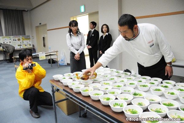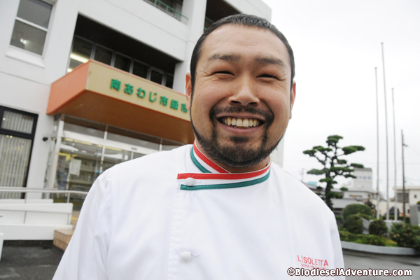 島の特産試食会も催された。地元で採れた菜種油、藻塩や南あわじ特産の手延べ麺”淡路島ヌードル”など、どれもとても美味しい!! おもしろいのがこの”手延べ麺”。うどんと素麺のハイブリッドのようで和風、洋風、アジア風にも合いそう。この日のシェフは、イタリアンレストラン「リゾレッタ」の井壺さん。イタリアでの修行経験があり、なんと岡田さんの教え子でもあるそうだ。