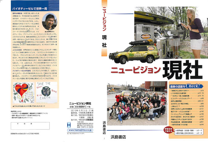 浜島書店という出版社から電話があり、高校生が使用する今年の現代社会の資料集『ニュービジョン現社』の表紙と裏表紙にバイオディーゼルアドベンチャーの取り組みを取り上げたいという。表紙を見た高校生がこの本をきっかけにバイオディーゼル燃料や環境問題に興味をもってくれることを願ってのことだそうだ。