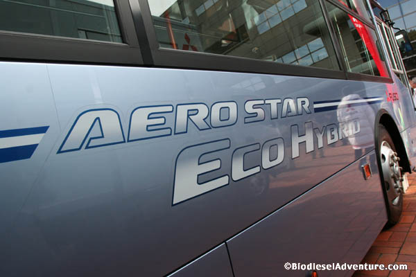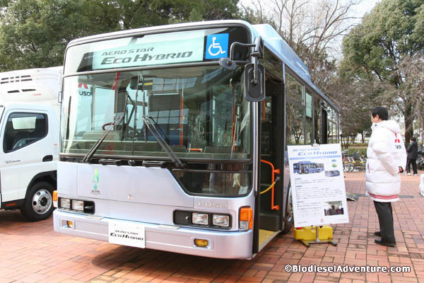 その隣には電気とディーゼルエンジンのハイブリッドで動く三菱FUSOのバスがあった。動力は電気モーターだが、バッテリーの出力が下がるとディーゼルエンジンが始動し、発電機を使って電気を起こすというもの。