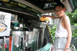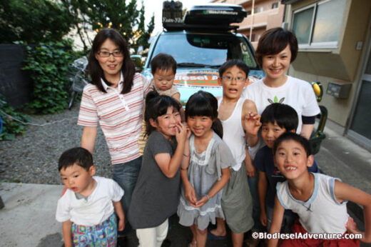 路地をバックしていると田中さんのお隣の奥さんが油を持って駆けつけてくれた。田中さんのお子さん達にも車のプラントに廃食油を入れていただいた。ワ〜、なにこれ!という声やすげ〜など歓声があがる。給油後、みんなで記念写真を撮った。