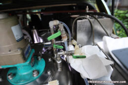 この写真は、すでに一度反応して作ったバイオディーゼル燃料をもう一度反応タンクに移して、水分とメタノールなどを除去するためにラインを変えているところ。いつもとは違う手順なのでけっこう大変だ。