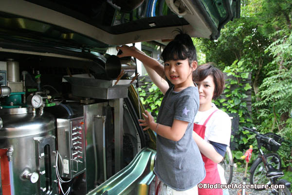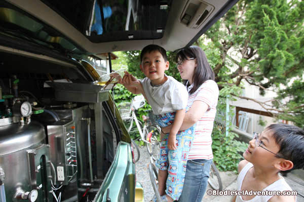 路地をバックしていると田中さんのお隣の奥さんが油を持って駆けつけてくれた。田中さんのお子さん達にも車のプラントに廃食油を入れていただいた。ワ〜、なにこれ!という声やすげ〜など歓声があがる。給油後、みんなで記念写真を撮った。