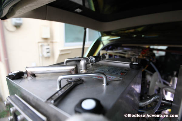 この写真は、すでに一度反応して作ったバイオディーゼル燃料をもう一度反応タンクに移して、水分とメタノールなどを除去するためにラインを変えているところ。いつもとは違う手順なのでけっこう大変だ。