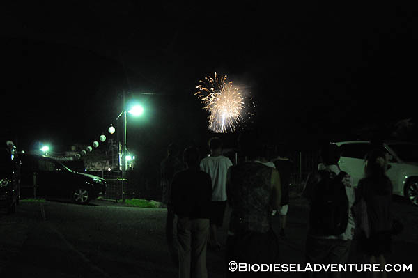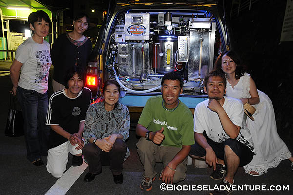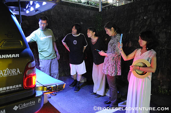 演奏の後、みなさんと近く行われる花火大会を眺めた後、やの雪さん、赤城さん、「築城せよ!」の映画監督、古波津陽さんら皆さんが、僕の車を見学してくれた。夜のバスコファイブは照明が光って、昼間とはまた違う雰囲気がある。「バックトゥーザフューチャーみたい!」と喜んで頂けたようだ。