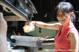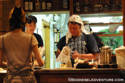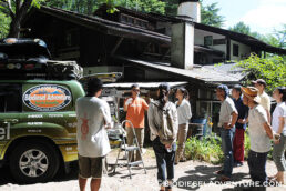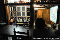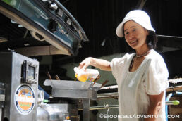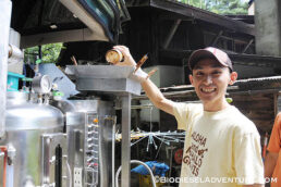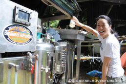 廃油を約15リッター、スタッフやゲストの皆さんに注いで頂いた。さらに敷地内で電源をお借りして、精製もさせて頂いた。スタッフの皆さんからは「触媒とは何?」とか「一度にどれくらいの燃料ができるの?」「満タンにしてどれくらい走るのか?」などの熱心にプラントを見ながら質問が飛び交う。