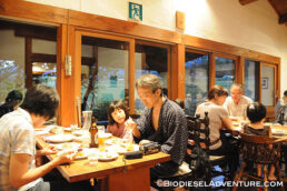 夜は、シャロムご自慢のお料理を頂くことに。シャロムのお客さんやスタッフを前に講演することと引き換えに宿泊、食事をご用意していただいたのだ。(※臼井さんは、講演と引き換えでなくてもたぶん無償で泊まらせていただいに違いない。そういう人だ)