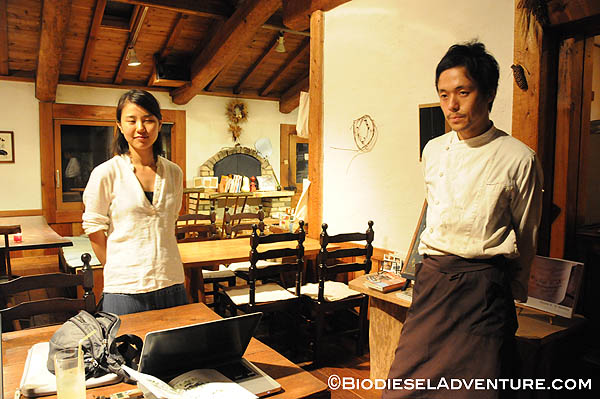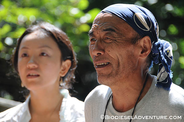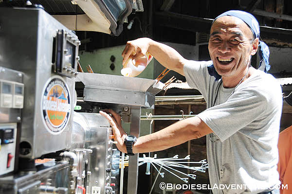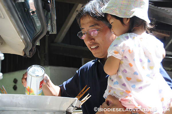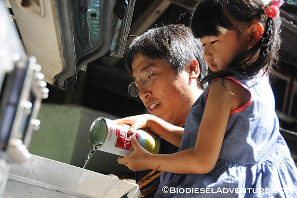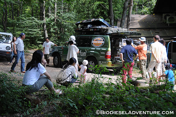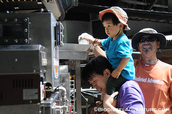 廃油を約15リッター、スタッフやゲストの皆さんに注いで頂いた。さらに敷地内で電源をお借りして、精製もさせて頂いた。スタッフの皆さんからは「触媒とは何?」とか「一度にどれくらいの燃料ができるの?」「満タンにしてどれくらい走るのか?」などの熱心にプラントを見ながら質問が飛び交う。