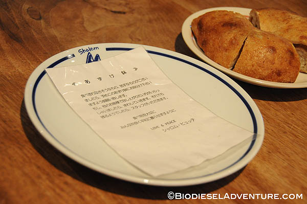 夜は、シャロムご自慢のお料理を頂くことに。シャロムのお客さんやスタッフを前に講演することと引き換えに宿泊、食事をご用意していただいたのだ。(※臼井さんは、講演と引き換えでなくてもたぶん無償で泊まらせていただいに違いない。そういう人だ)