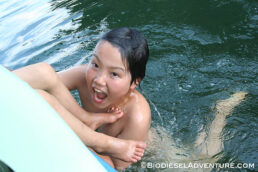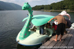 木崎湖でボートに乗ることになった。大型の足こぎボートを30分。乗るのはスワンちゃんではなく、恐竜号。「恐竜はいりま〜す」のかけ声とともに、乗り込む僕ら。思わずどぼんと飛び込んでいく州(シュウ)くんとレンタの2人、ひとりはマッパだ。ウン、男らしいぞ! この湖はとてもきれい浅いところは湖底がすけてみえるほどだった。