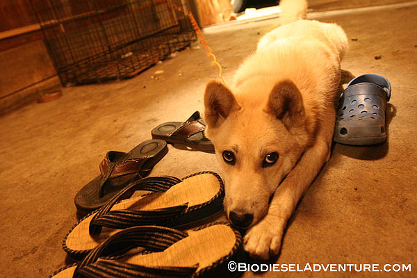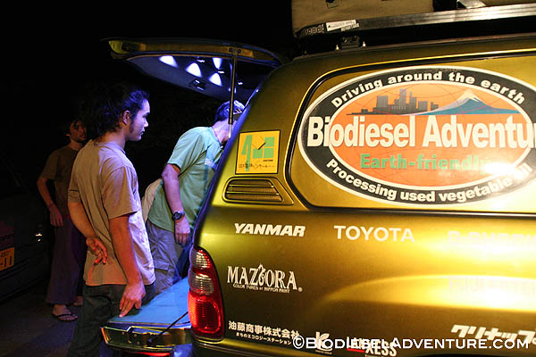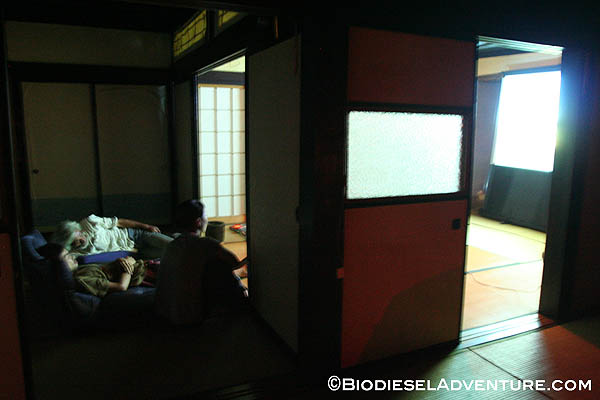 今日は旅人のしゅう君お手製の美味しいお好み焼きでカンパーイ! その後は僕のプチスライドショーを見て頂いた。なんと贅沢なビックスクリーンを間近に。夜も遅かったのに、みんなに喜んでもらえたようでうれしかった。