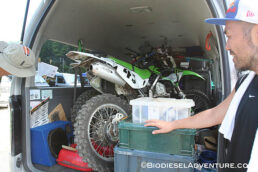 昨日「ほんやら洞」のオーナー・本田さんが「明日八坂オフロードでちょっとした走るミーティングがあるからよかったら来ませんか?」と声をかけてくれた。それはぜひ!と行ってみることに。向かったのはゴール地点。いるいる、トランポが並んでるぞ〜。汗だくで走り終えたライダーが木陰で涼んでいる。