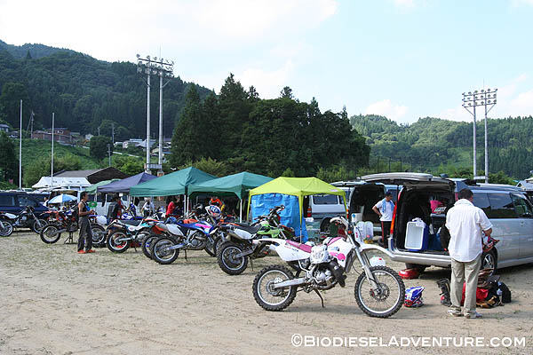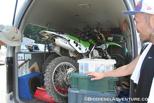 昨日「ほんやら洞」のオーナー・本田さんが「明日八坂オフロードでちょっとした走るミーティングがあるからよかったら来ませんか?」と声をかけてくれた。それはぜひ!と行ってみることに。向かったのはゴール地点。いるいる、トランポが並んでるぞ〜。汗だくで走り終えたライダーが木陰で涼んでいる。