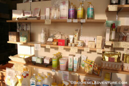 「コンニチハ〜」とおじゃますると、木の温もりが優しい雰囲気の店内には、食材や飲料から小物や本まで、たくさんの体を元気に健康にするモノたち。エコ石けん&洗剤の数々にも驚いた。こんなにたくさん種類があったら選ぶのも楽しいだろうな〜。「人によって肌質や好みも違うので、合ったものを選んで頂きたくて」と木下さん。
