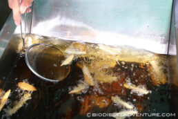 揚げカスも少ないし、いい燃料になるはず!「廃油の処分に困っていたんです。逆に助かります!」と言って頂いた社長さんの樋口さん、聞けば本職は建築大工さんなのだそう。