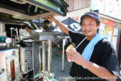 最後に、目の前にある屋台「いもや」さんから油を頂くことができた! フライドポテトやオニオン揚げなど使ったばかりのほかほかな油を25リッター頂戴する。