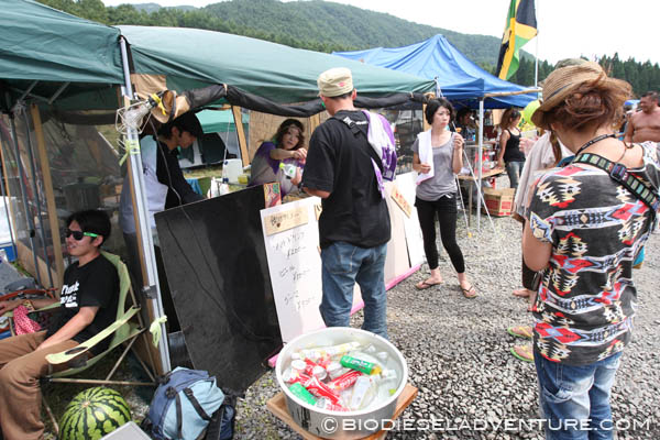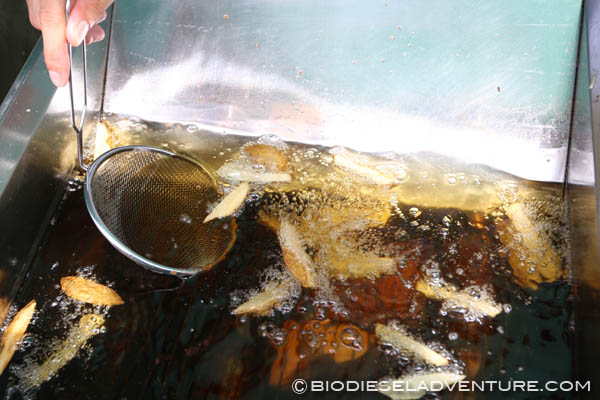 最後に、目の前にある屋台「いもや」さんから油を頂くことができた! フライドポテトやオニオン揚げなど使ったばかりのほかほかな油を25リッター頂戴する。