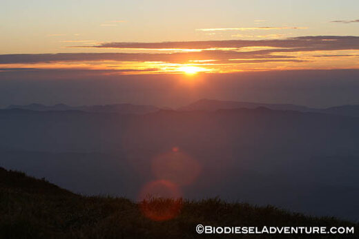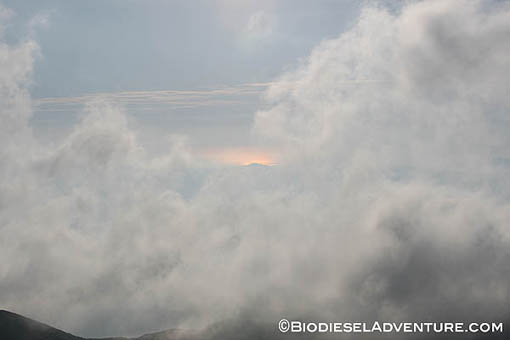 月山頂上についたときにはもう陽も落ちるところで、肌寒い風が吹き始めていた。誰もいない山頂の中で、美しく沈んでいく夕陽をみたり、折り重なるシルエットが浮かび上がる景色に見とれていた。