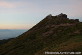18時、山頂へ到着。頂上は風が強く、霧に包まれていた。山小屋で20分ほどひと休み。山頂の月山神社本宮はもうクローズしてしまったので、門前で祈りを捧げる。こちらには、月読命(つくよみのみこと)が祀られているという。