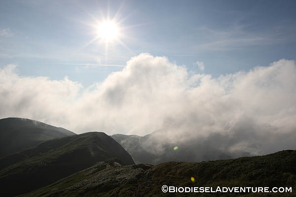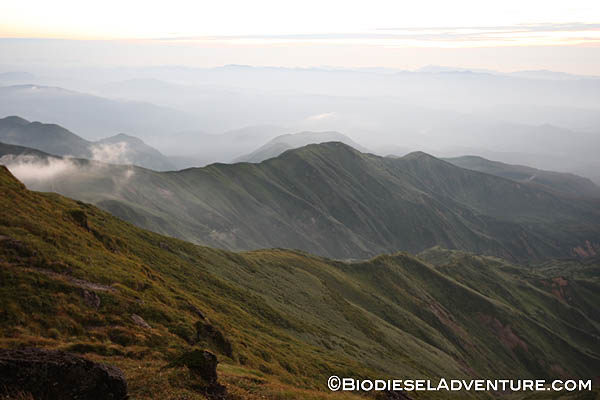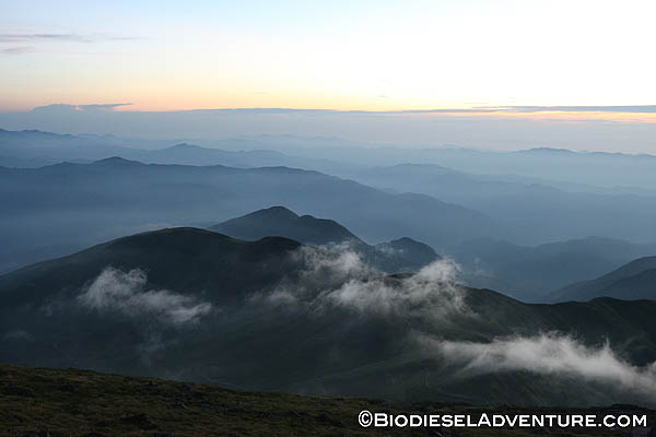 月山頂上についたときにはもう陽も落ちるところで、肌寒い風が吹き始めていた。誰もいない山頂の中で、美しく沈んでいく夕陽をみたり、折り重なるシルエットが浮かび上がる景色に見とれていた。