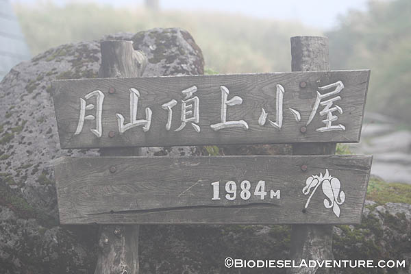 18時、山頂へ到着。頂上は風が強く、霧に包まれていた。山小屋で20分ほどひと休み。山頂の月山神社本宮はもうクローズしてしまったので、門前で祈りを捧げる。こちらには、月読命(つくよみのみこと)が祀られているという。