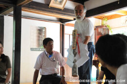 星野さんはこの羽黒の宿坊「大聖坊」の三男として生まれ、昭和46年25歳のときにこの宿坊を継承した。「尚文」という山伏名を拝命し、現在では山伏の修行体験を指導している。かつて宿坊の村であった羽黒だが、現在ではこのような山伏体験のできるところは、わずかにここ大聖坊のみ。