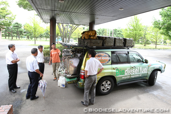 「CO2削減しようと、大潟村ではB5を販売するスタンドがあるのですが、なかなか流通がうまくいかないのが現状なんですよ」とタカハシ村長。給食やレストランなど市民回収で集められた廃食油を、民間の企業に委託して別市でBDFを精製。昨年、村内でBDFと軽油の混合施設を作りB5スタンドを完成させ、販売している。だが、軽油自体を安く購入できなかったり、運送コストがかかったりといった理由で、なかなか受け入れてもらえず循環できずにいるという。