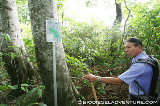 そこから”高倉の森”への山道に入る。30分ほど歩いていくと、”世界遺産地域”の小さな看板。ここから先が世界遺産なのだそうだ。薄緑の部分は緩衝地域、濃緑の部分は核心地域。僕らは今その世界遺産区域の隅っこにいる。