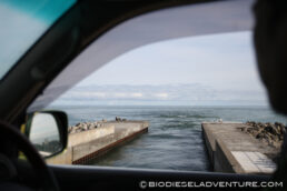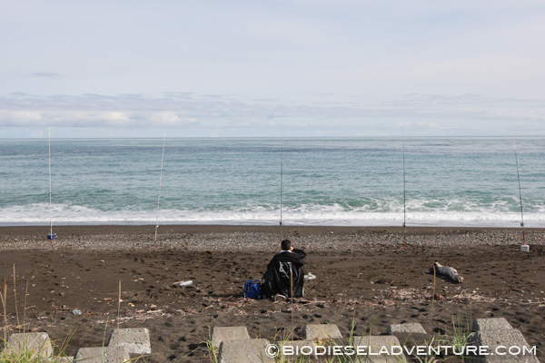 朝8時30分。コムケ国際キャンプ場を出る。ダートを少し走ると、海岸へ出た。おっ、釣り人発見。みんな竿を5本6本と砂浜にさして、じーっと待って様子。なにが釣れるんだろ?「すみませ〜ん、あのぅ、何釣ってるんですか?」