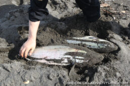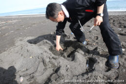 「アキアジだよ」「アジですか?」と、砂を掘り返しはじめた。なんと、シャケが出てきた〜!
