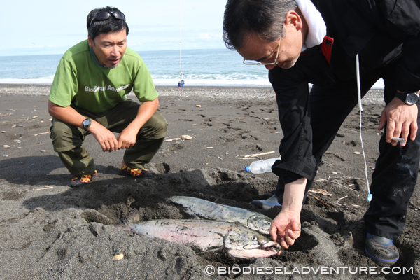 今の時期、冬の遡上前のシャケが海岸で回遊をしている。海水から淡水へ変わるのでここで体を慣らし、自分の育った川を見つけ出して遡上していくのだ。それをアジアジと言うのだ。おじさんが釣ったシャケは2匹。大きくてあごがいかついほうがオスで、小さいほうがメス。メスは卵をお腹に抱えている。「メスは卵に栄養をとられているから、そんなに味は特別よくないですよ。オスもそう。でもスジコとシラコは美味しいよ〜」とおじさんはニコッと笑った。